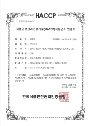 HACCP 적용업소 인증서